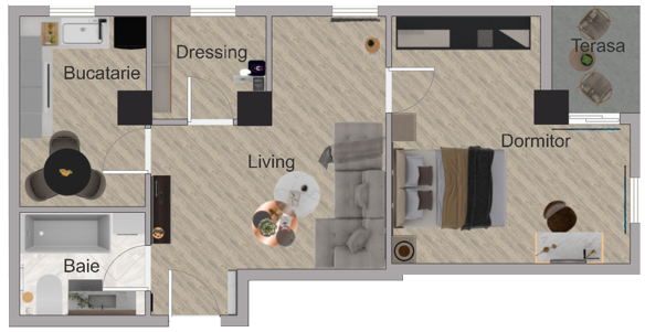 Apartamentul de la Demisol poate dispune și de o terasă exterioară.